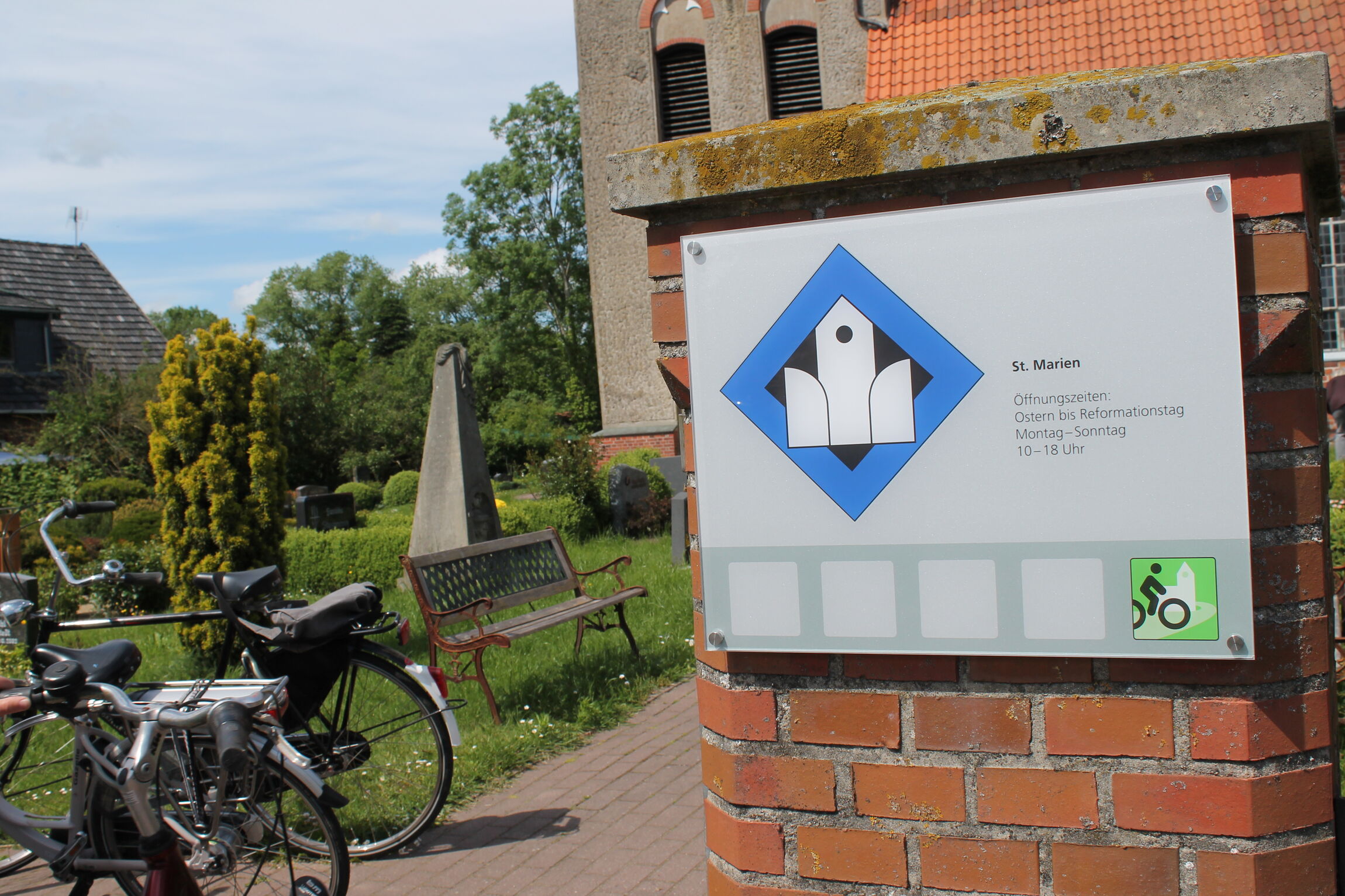 Pastorin Antje Wachtmann, Referentin für Kirche im Tourismus, hatte das nagelneue Schild mitgebracht. Das soll Menschen nicht nur darauf hinweisen, das die Kirche zwischen Ostern und dem Reformationstag verlässlich von 10 bis 18 Uhr geöffnet ist: Mit dem Fahrradsymbol sollen insbesondere Radler animiert werden, eine Rast in der Kirche, die sogar eine Toilette hat, einzulegen.