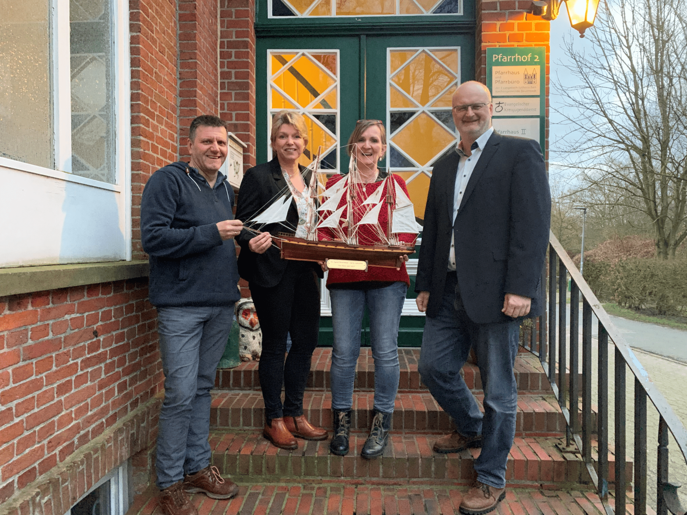 Für ordentlich Wind in den Segeln der "Flotte" hat die VGH Versicherung Heinrich Jäger OHG aus Beverstedt jetzt gesorgt: Sie spendete 1500 Euro für die große Konfirmandensegelfreizeit des Kirchenkreises Wesermünde. Bereits in den vergangenen Jahren haben Andrea (Zweite von links) und Bernd Jäger (rechts) die "Flotte" finanziell unterstützt. Das freut nicht nur die rund 500 Jugendlichen, die Ende März auf dem Ijsselmeer in See stechen. sondern auch Kreisjugenddiakon Michael Hinrichs und Andrea Ullrich vom Förderverein der Evangelischen Jugend "freun.de".