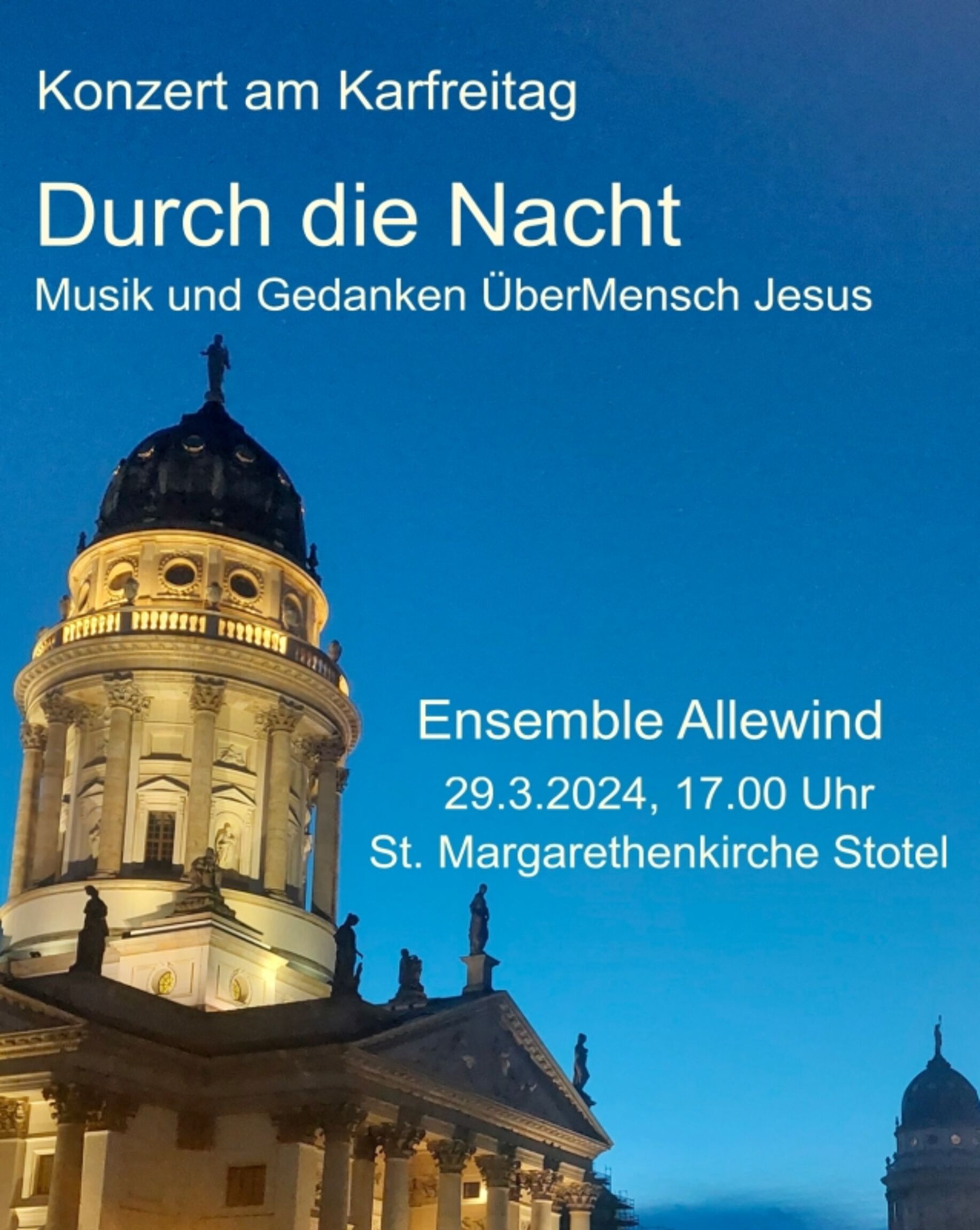Ein besonderes Konzert an einem besonderen Tag gibt es am Karfreitag um 17.00 Uhr in der Stoteler Kirche. Unter dem Titel "Durch die Nacht" geht es in Musik und Texten darum, wer der Mensch Jesus war und wer wir als Menschen sind. Das Ensemble Allewind wird wie immer in seinen Konzerten für einige musikalische Überraschungen sorgen.