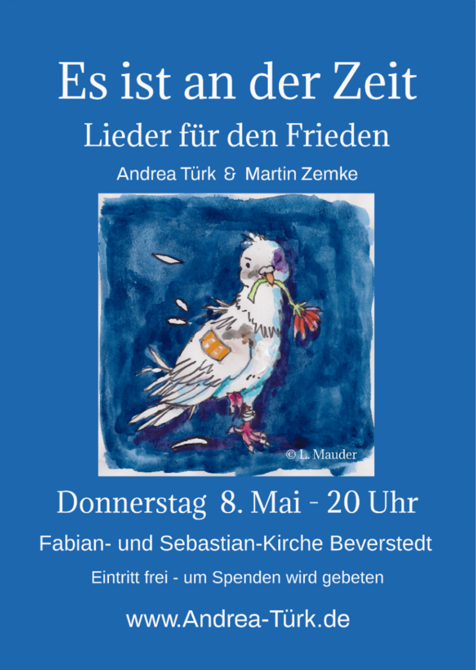 In Beverstedt findet in Kirche ab 20 Uhr außerdem ein Konzert statt. Andrea Türk und Martin Zemke singen und spielen Friedens- und Anti-Kriegs-Lieder von "Sag mir, wo die Blumen sind" über jiddische und französische Lieder bis hin zu Stücken von Reinhard Mey und Hannes Wader in neuen Interpretationen. Der Eintritt ist frei.