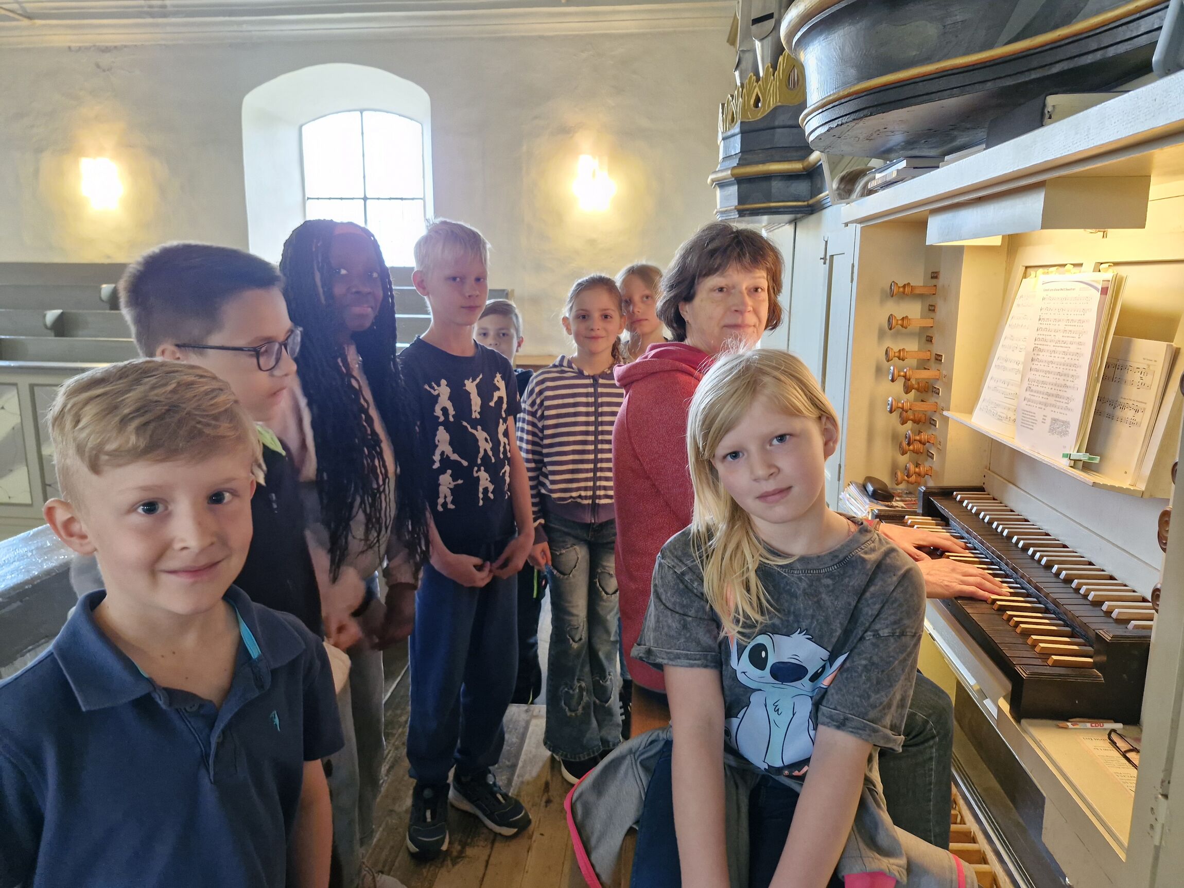 Organistin Sabine Steilen stellt das riesige Instrument vor, verrät, dass es 20 Register und fast 1400 Pfeifen hat. „Die großen sorgen für tiefe, die ganz kleinen für sehr helle Töne.“ Die Grundschüler erfahren, dass man auch mit den Füßen die Orgel zum Klingen bringen kann – wenn man mindestens 1,40 Meter groß ist. „Am besten fängt man erst einmal mit dem Klavier oder Keyboard an, bevor man dann Orgel lernt“, sagt Sabine Steilen. Paul hat ein Keyboard und spielt „Freude schöner Götterfunken“ an – seine Mitschülerinnen und Mitschüler singen gleich mit. Durch Musiklehrerin Ute Stemberg sind die Kinder bestens vorbereitet. Alle dürfen mal auf der Orgelbank Platz nehmen, Register ziehen und Tasten drücken, bevor Sabine Steilen wieder übernimmt. „What shall we do with a drunken sailor?“ – das geht auch auf der Orgel, vor allem, wenn Kinder mitsingen, stampfen und klatschen.
