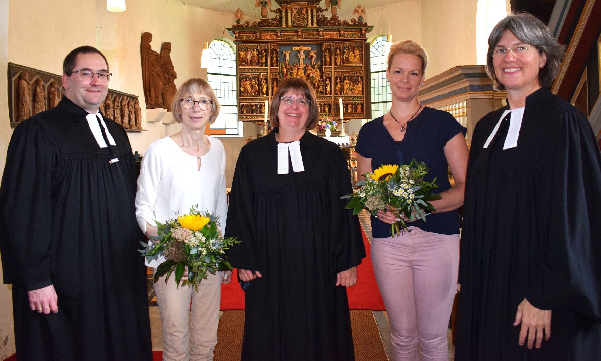 Der Gottesdienst war vom Diakonie-Ausschuss sorgfältig vorbereitet. Im Rahmen dieser Tradition begrüßte die Superintendentin als Vorsitzende des Diakonie-Vorstandes die neuen Mitarbeiterinnen Jessica Petrasch und Silke Knieling von der Kirchenkreissozialarbeit der Diakonie Cuxland. Vera Mollérus, zuständig für die Schwangerschaftskonfliktberatung, war verhindert. Die langjährige Mitarbeiterin Gerda Kronschnabel, die zum Monatsende in den Ruhestand geht, konnte krankheitsbedingt nicht verabschiedet werden.