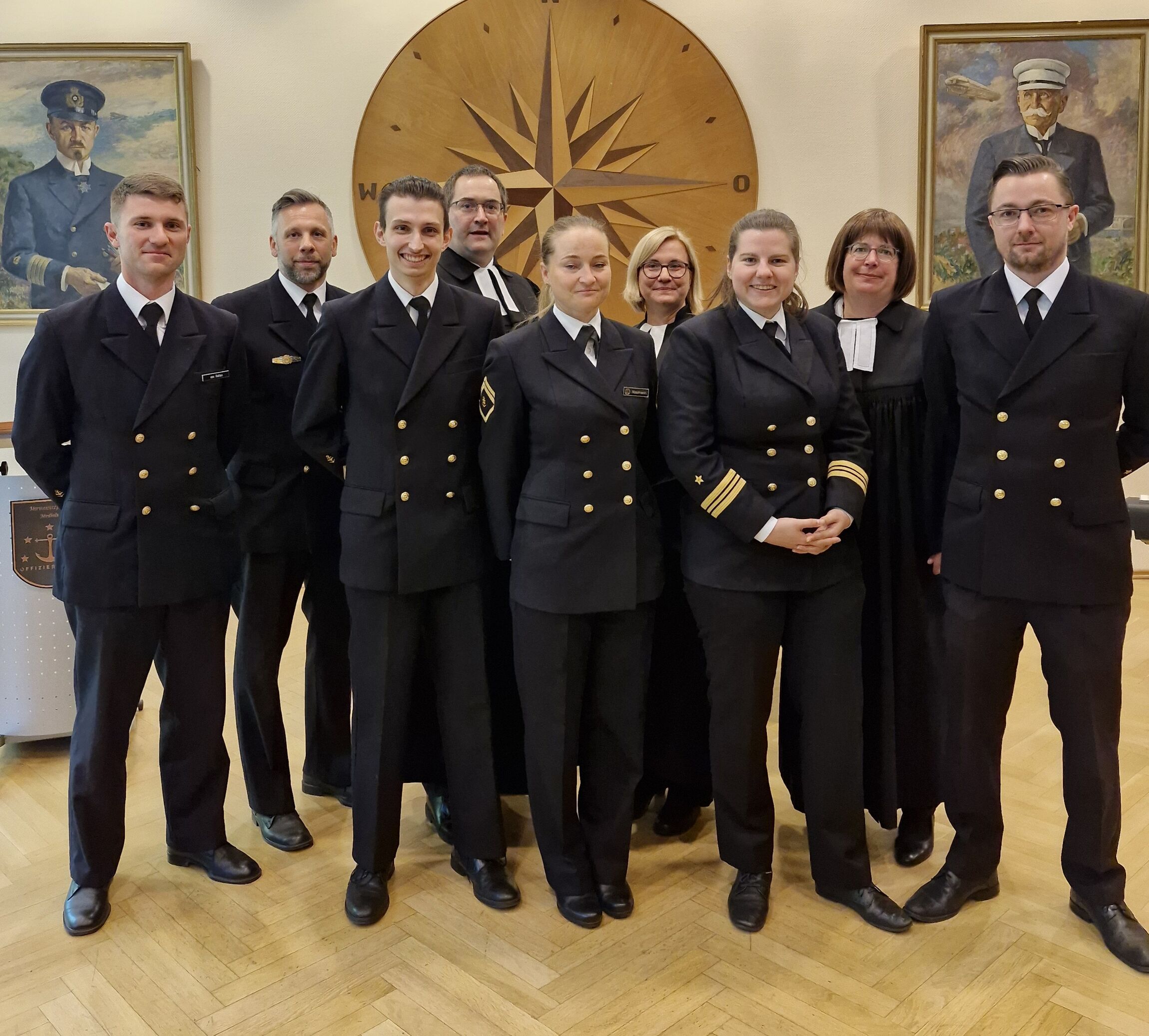 Mehr als 70 Gottesdienstbesucher*innen aus Marine und Zivilgesellschaft begrüßt Militärpfarrerin Dr. Katja Bruns am Donnerstagmorgen in der Messe. Die Theologin hat sich in der Vorbereitung gemeinsam mit den Soldatinnen und Soldaten mit dem Kriegsende thematisch auseinandergesetzt. Die Auswahl der Zeitzeugenberichte ist ein Ergebnis dieser Arbeit. Ein weiteres Kapitel wird Ende des Monats aufgeschlagen: Dann reisen sie gemeinsam auf den Spuren des Zweiten Weltkriegs in die Normandie und treffen dort auch mit französischen Militärangehörigen zusammen.