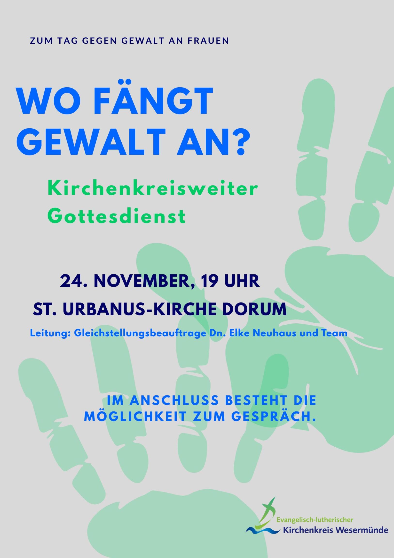 Wo fängt Gewalt an?“: Diese Frage steht über dem Gottesdienst am Montag, 24. November, 19 Uhr in der Dorumer Kirche. Anlass für diesen kirchenkreisweiten ist der „Tag gegen Gewalt an Frauen“.